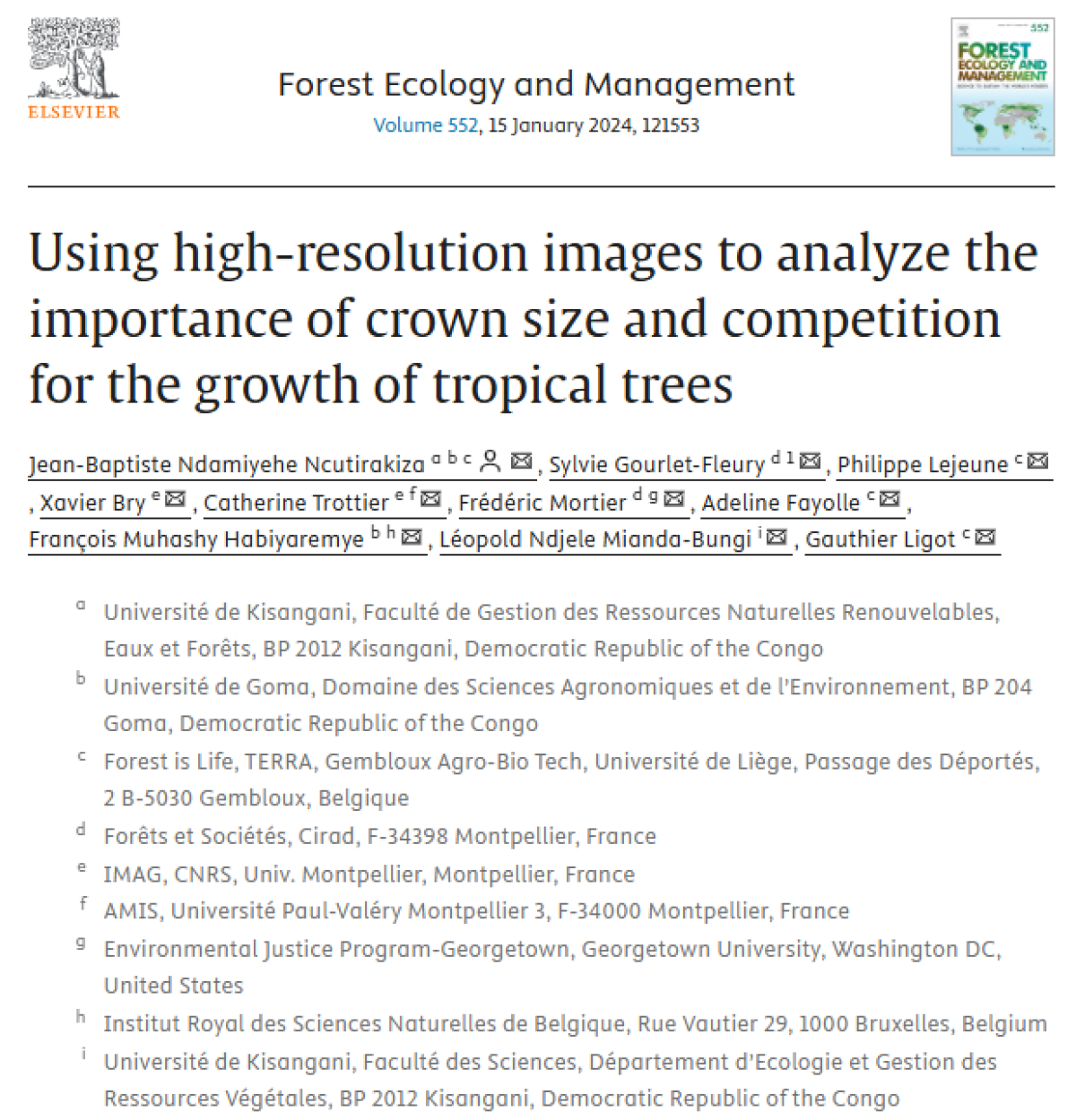 Four experimental 9 ha plots were sampled in two forest sites, Yoko in the Democratic Republic of the Congo and Loundoungou in the Republic of Congo. Field inventories were made between 2015 and 2020. For each tree, we computed the diameter increment (DBHI) using censuses and diameter-based competition indices (diameter-based CIs) using the first census. High-resolution orthoimages and digital surface models were acquired with UAVs in 2016 and 2018 in the two sites. They gave estimates of crown characteristics (size, relative elevation, shape) and crown-based competition indices (crown-based CIs). Co-recorded UAV and field measurements were obtained for 1558 trees. The diameter increment of these trees was then modelled using supervised component generalized linear regression, and 20 % of trees were kept for cross-validation.